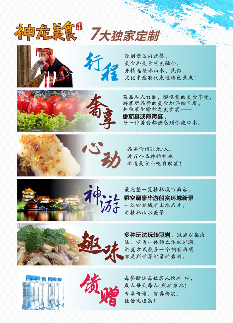 3、用餐:含3早5正餐(大部份住宿酒店含早餐,围桌或自助,由酒店统一安排,如酒店不含早则餐标为5元,早餐4点1粥(桂林米粉、包子、馒头、油条、稀饭,部份餐厅品种略有不同,以实际用餐餐厅安排的为准,其中两餐为特色餐,其余正餐为15元/人.餐;正餐10人1桌,8菜1汤,餐厅可根据实际用餐人数酌情增加或减少菜量,为保证餐饮质量,如拼团客人不足6人,则建议退餐费给客人15元/人/餐)。因南方用餐以大米为主食,不保证每餐有馒头提供,若提供,限一人一个。