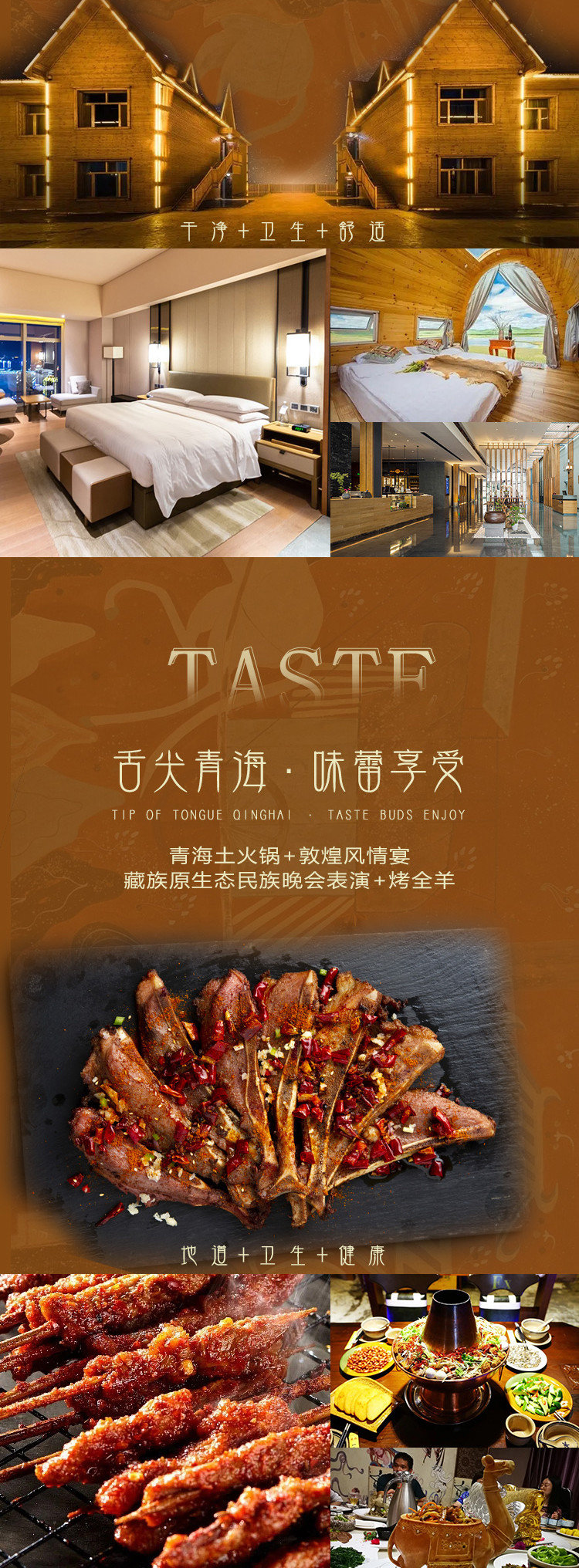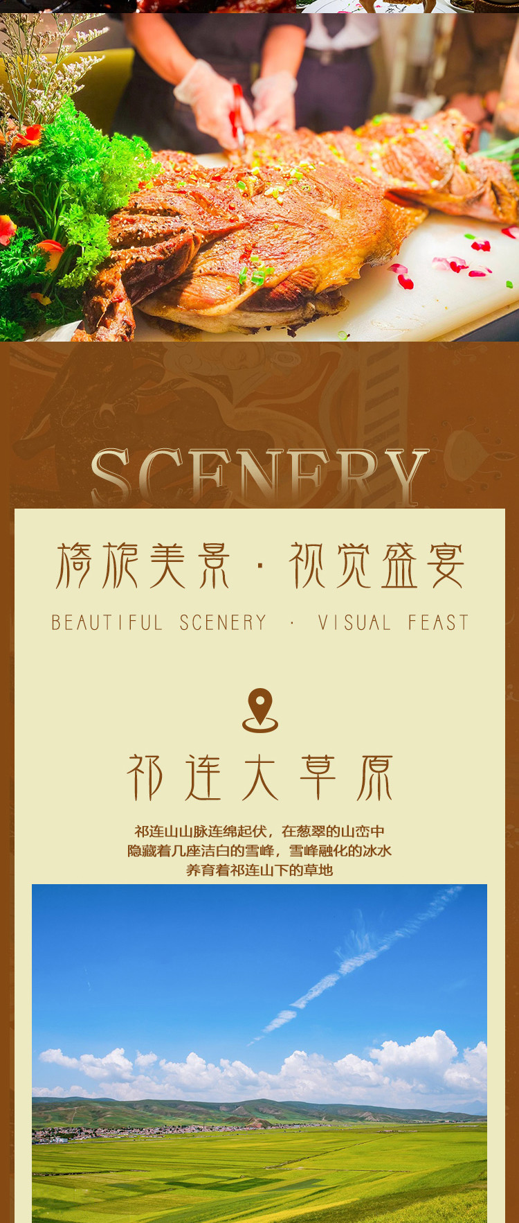 特色餐:品尝烤全羊(烤全羊安排标准:1-8人烤羊腿,9-15人半只烤全羊,16人以上一只烤全羊)、西北小吃宴、驴肉黄面特色餐、藏王宴、民族风味特色餐。