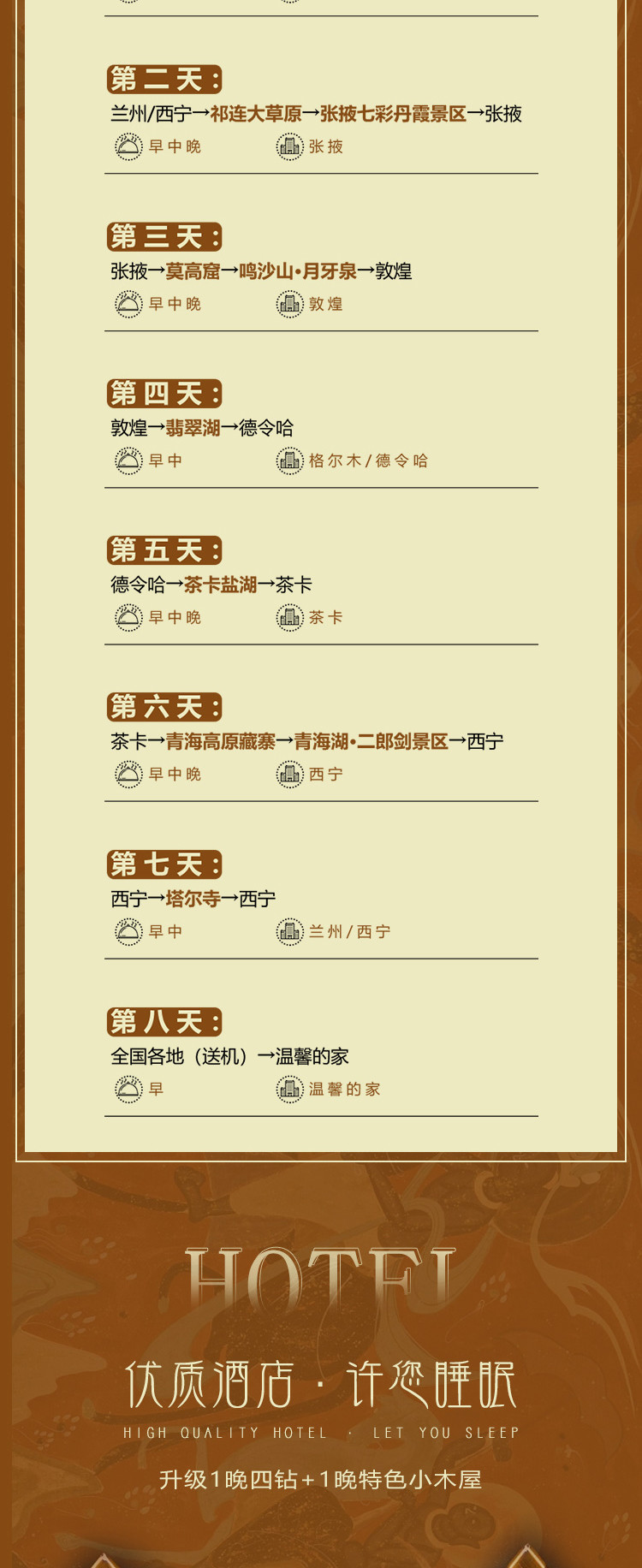 西北地区发展比较落后,住宿硬件和软件均不能和城市同级酒店相比较,请勿以城市标准衡量。高原地区,热水为定时供应! 敬请游客理解!餐食行程中所列餐食(飞机餐是否收费请参照航空公司规定)7早,11正餐