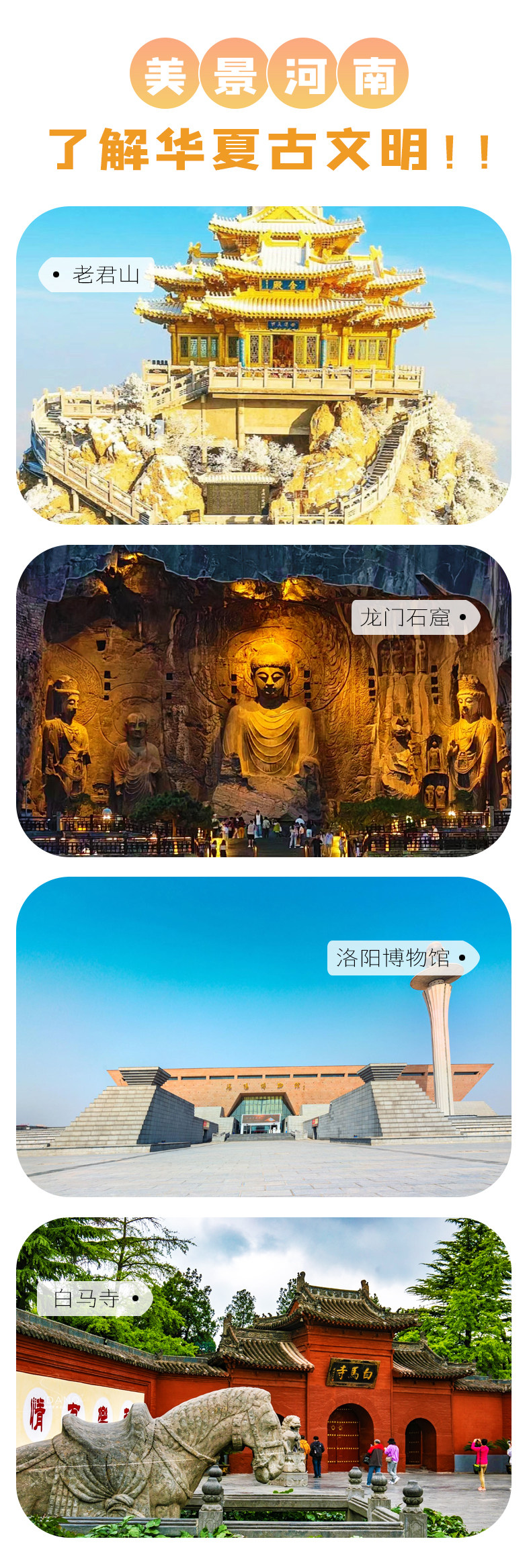 【景点门票】:老君山风景名胜区、龙门石窟、洛阳博物馆、白马寺